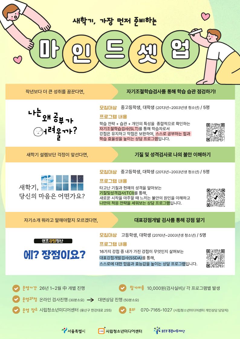 새학기를 맞이하며, 새로운 마음, 새로운 생각으로 마인드셋업을 하기 원한다면, 심리검사를 통해 나를 객관적으로 살펴보는 시간을 가져보세요. 1) 나는 왜 공부가 어려울까? - 대상: 2013년~ 2003년생 청소년(중학생 이상)/ 5명(선착순 모집) - 신청 링크: https://forms.gle/yrHPLTkthCcmZV2w5